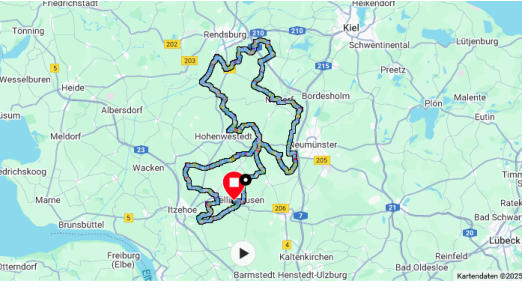 204,74 km Distanz 7:31:34 Zeit 27,2 km/h Ø Geschwindigkeit und 819 m Höhenmeter standen hinterher auf der Uhr bei Stefan.